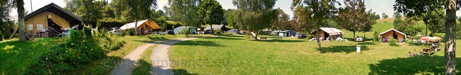 De meeste van de tenten staan rond een eerste grasveld met speelgelegenheid voor de kinderen en met aan de rand het zwembad van 11 x 6 x 1,40 m.